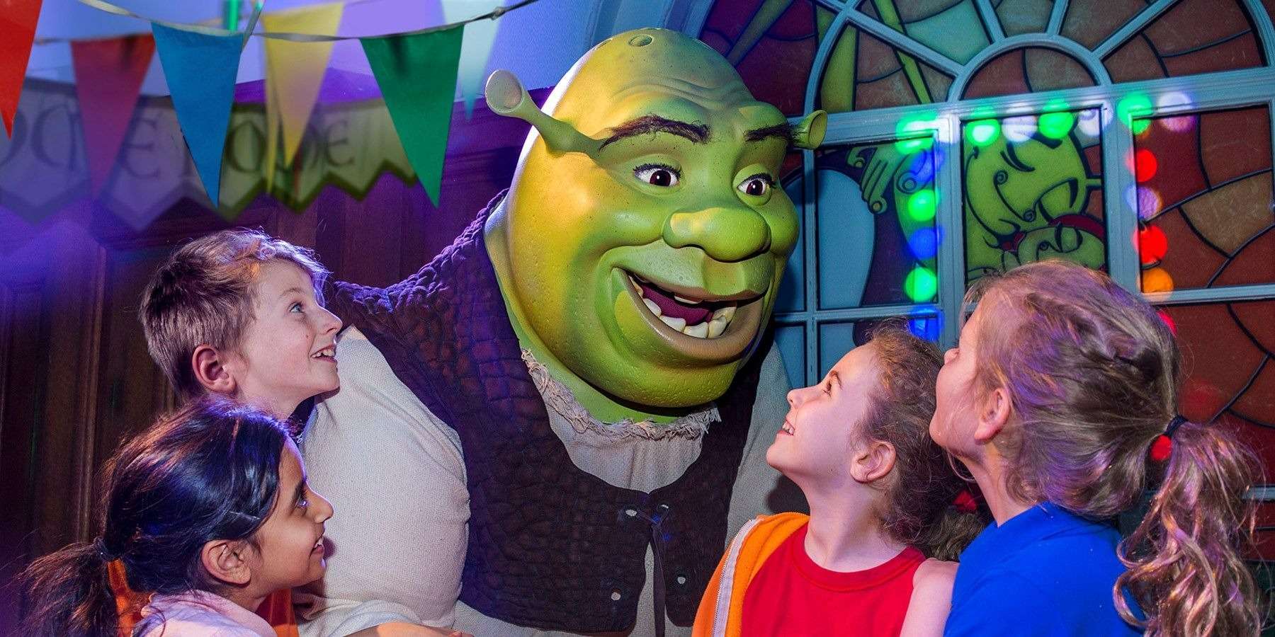 Assistance dogs are permitted at Shrek's Adventure. However, due to Health and Safety regulations, they are not permitted to ride the 4D magic bus. The dog must always be accompanied by a member of your team.